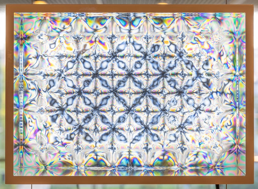 Visible Stress employs the naturally occurring physical phenomenon of photoelasticity, integrating it with existing industrial vacuum forming technology. This process visualizes the internal stress generated during vacuum forming as intricate textures of light. By introducing the “non-natural intervention” of human effort into the natural phenomenon of “invisible light,” the work presents a visually dazzling illusion that is both compelling and incongruous. Through this piece, viewers are invited to appreciate the light-texture generated by the pressure of the vacuum forming. Such an experience prompts a re-evaluation of how we perceive ourselves and our surroundings, inviting us to imagine the beautiful, unseen forces concealed within the world.